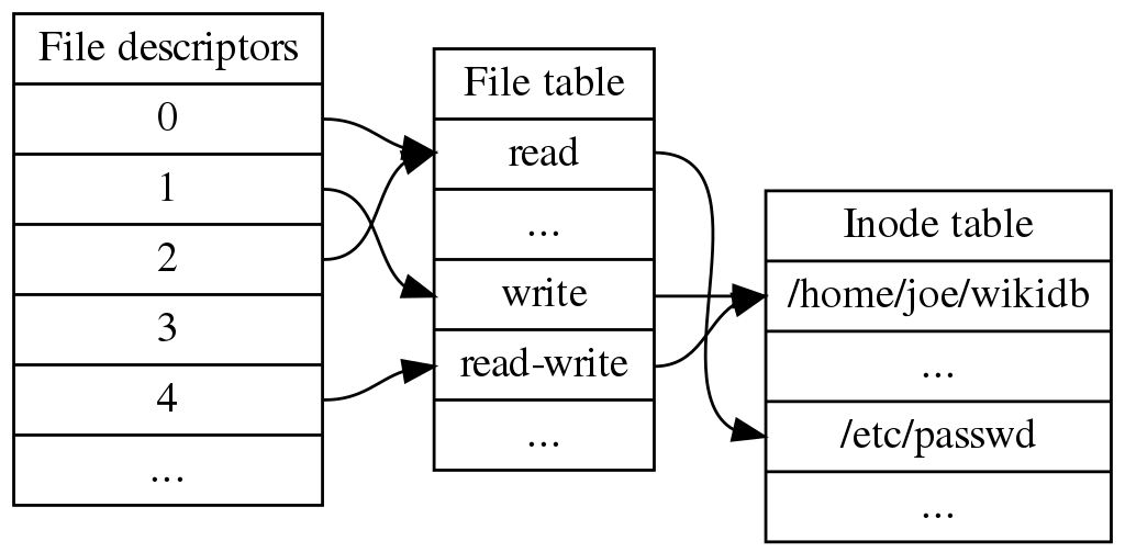 이 테이블은 다시 모든 프로세스에서 열린 파일 테이블에 색인되고, 파일이 열린 모드(읽기, 쓰기, 등)가 기록된다.