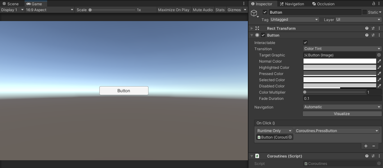 On Click 이벤트에 해당 버튼의 Coroutines 스크립트의 PressButton 함수를 연결해주었다.