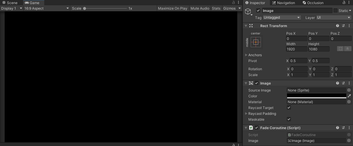 검은색 이미지를 화면에 채운 뒤 FadeCoroutine 스크립트를 부착시켰다.