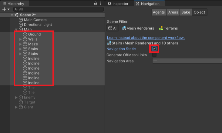 Hierarchy 창에서 탐색에 사용할 맵 오브젝트를 모두 선택해준 후, Navigation Static을 체크해준다.