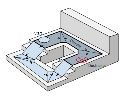 에이전트는 통로를 따라 보이는 가장 가까운 코너를 향해 움직이는 방법으로 목적지에 도달한다.