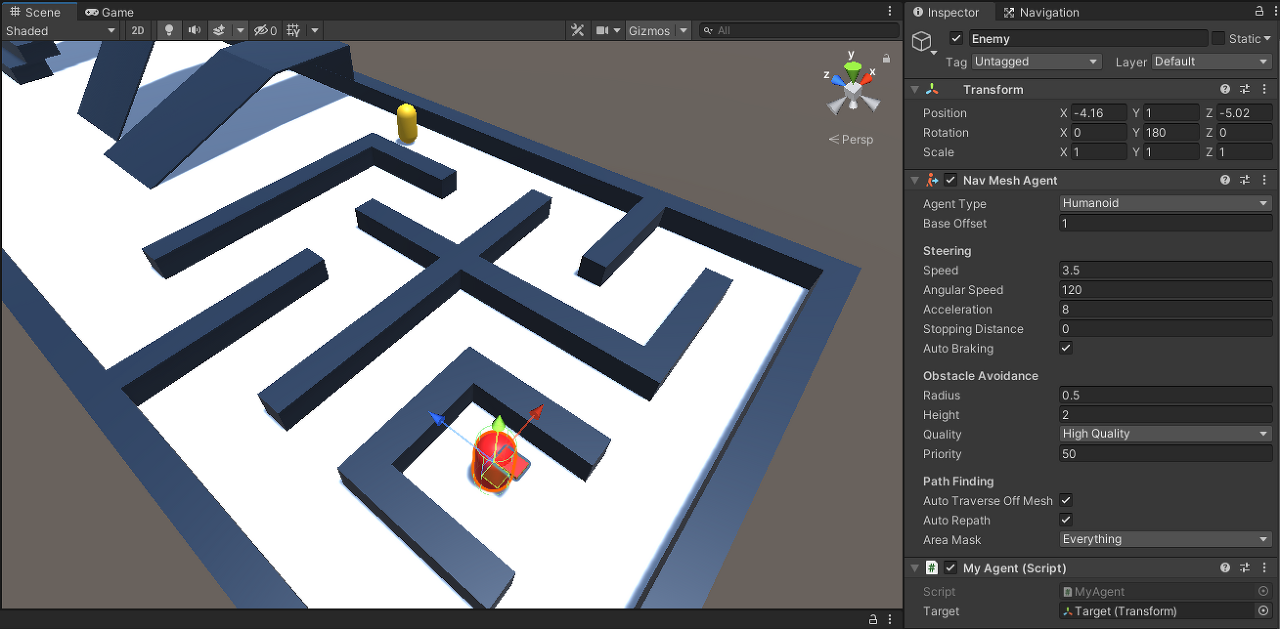 이를 이용하여 목적지까지 경로를 찾고 이동하는 캐릭터에 부착되는 컴포넌트가 NavMeshAgent이다.