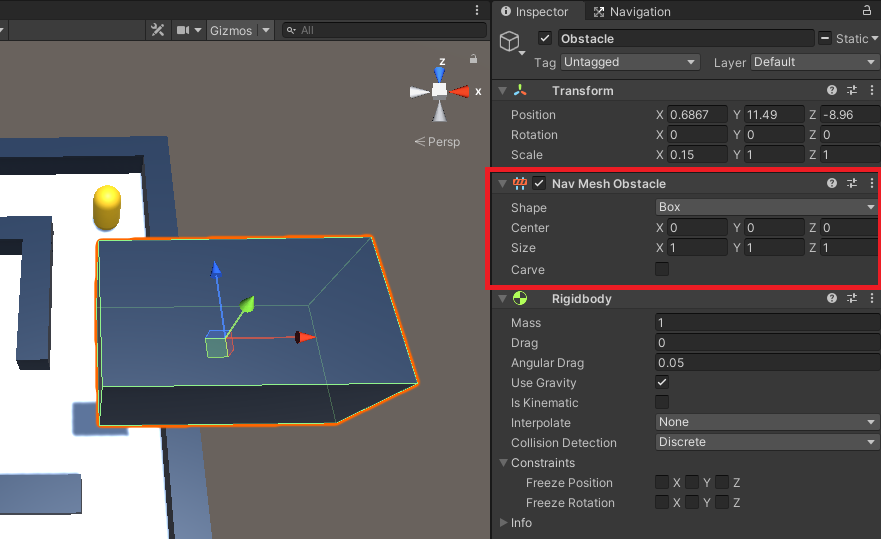 이번엔 장애물에 NavMeshObstacle 컴포넌트를 추가한다.